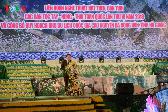Tối 13/5, tại thành phố Hà Giang, Bộ Văn hóa, Thể thao và Du lịch phối hợp với UBND tỉnh Hà Giang tổ chức khai mạc Liên hoan nghệ thuật hát Then, đàn Tính toàn quốc lần thứ VI năm 2018 và công bố Quy hoạch khu du lịch Quốc gia Cao nguyên đá Đồng Văn, tỉnh Hà Giang.