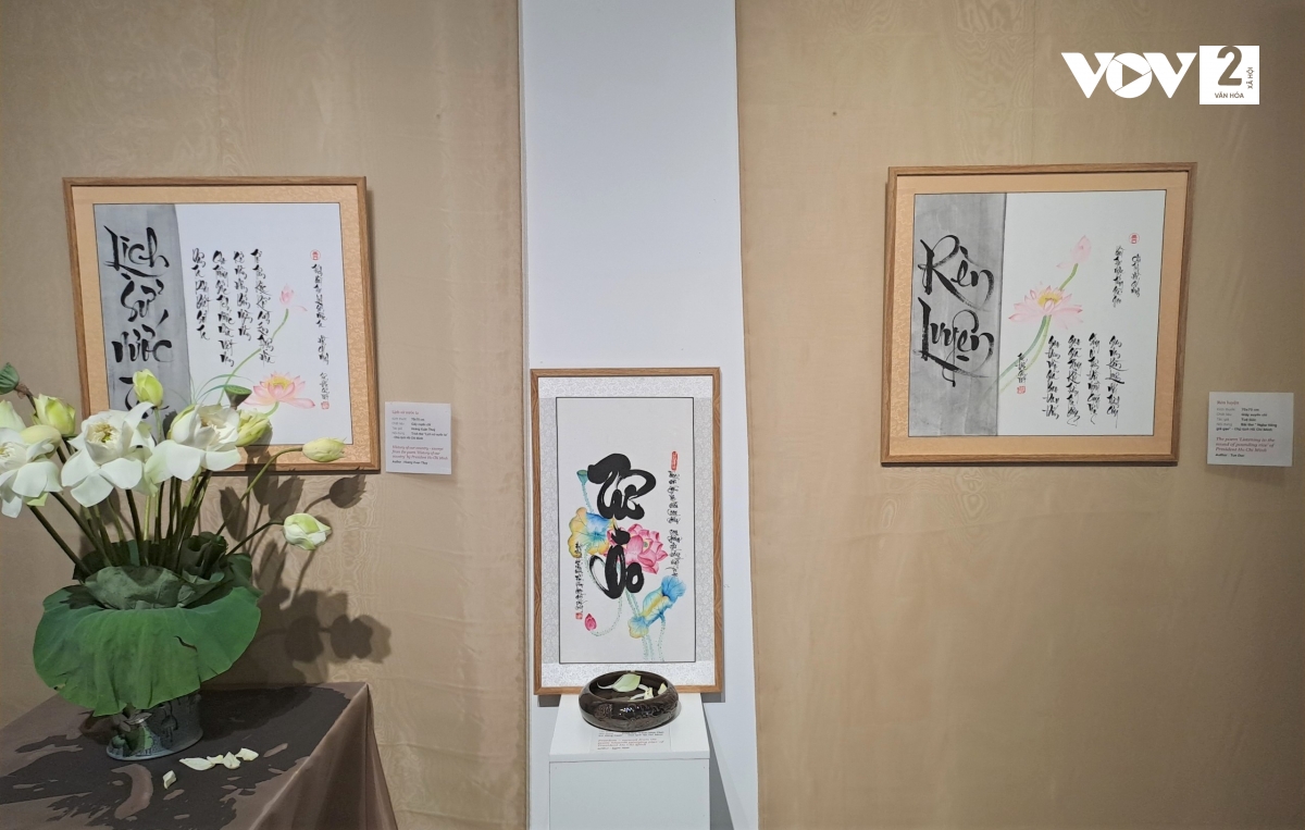 Một số tác phẩm Thư pháp Sen của nhà sưu tập, kỷ lục gia bộ sưu tập sen Nguyễn Thị Thanh Tâm. Ảnh: VOV2 |
