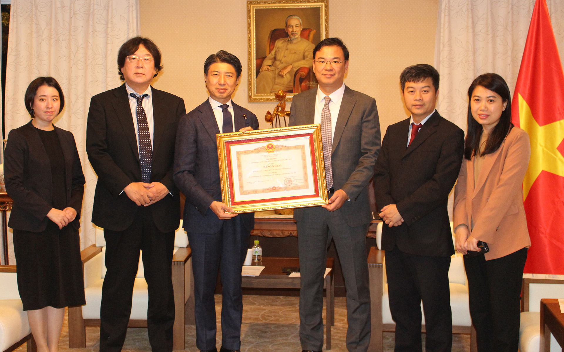 Đại sứ Phạm Quang Hiệu (bên phải) trao Bằng khen của Thủ tướng cho Hạ nghị sỹ Aoyagi. Ảnh: VOV Tokyo |