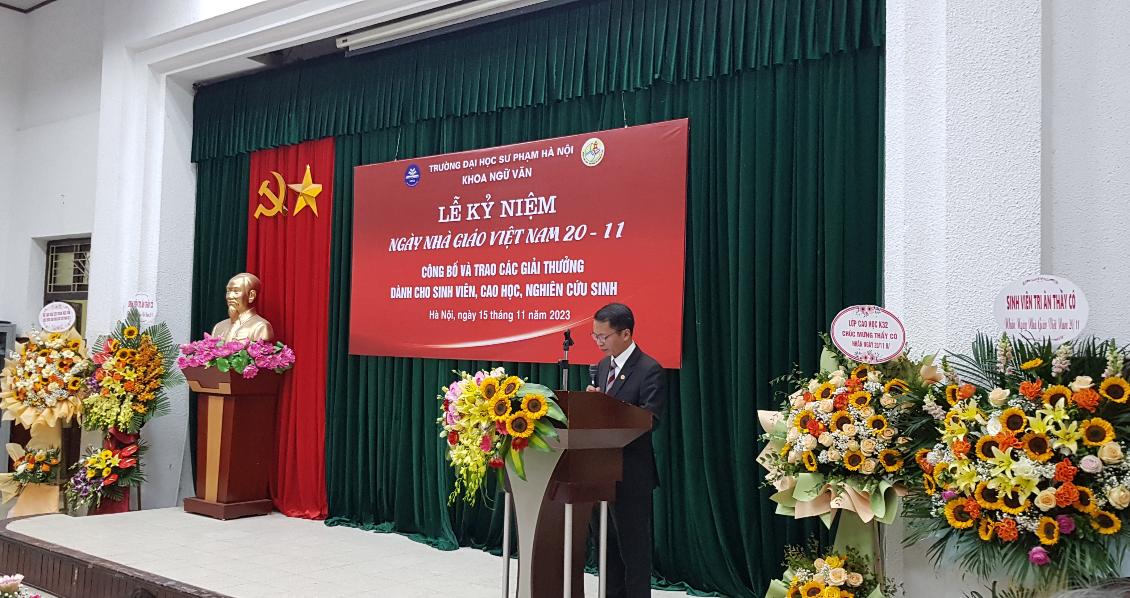 Phó Giáo sư, Tiến sĩ Hà Văn Minh, Trưởng khoa Ngữ Văn (Trường Đại học Sư phạm Hà Nội) phát biểu tại buổi lễ. |