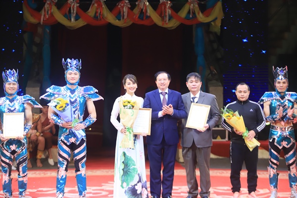 Thứ trưởng Bộ VHTTDL trao giải Người dàn dựng, Huấn luyện, Nghệ sĩ - Nhóm nghệ sĩ biểu diễn xuất sắc nhất. Ảnh: Quang Anh/ baovanhoa.vn |