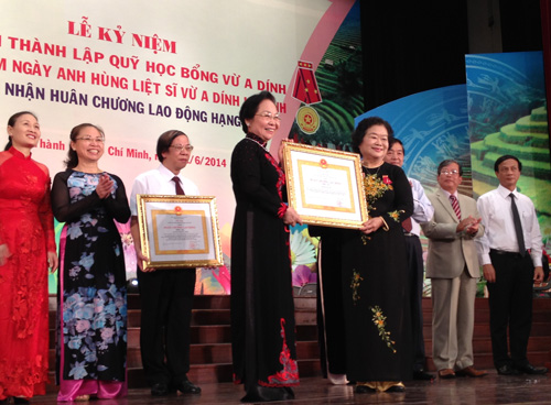 Tại buổi lễ, Phó Chủ tịch nước Nguyễn Thị Doan trao Huân chương Lao Động hạng Nhất tặng: Quỹ học bổng Vừ A Dính và bà Trương Mỹ Hoa, Chủ tịch Quỹ học bổng Vừ A Dính…