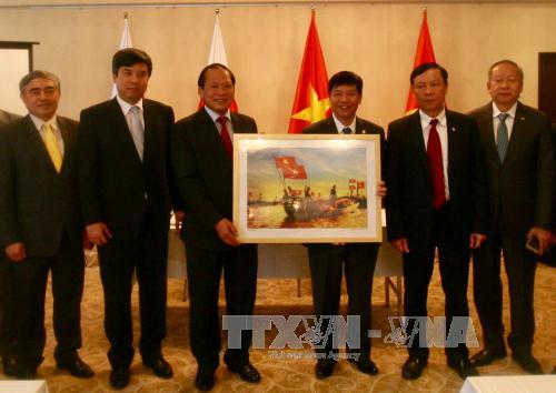 Bộ Thông tin và Truyền thông Trương Minh Tuấn trao tặng một bức ảnh cho Đại sứ quán Việt Nam tại Nhật Bản (Nguyễn Tuấn/PV TTXVN tại Nhật Bản)