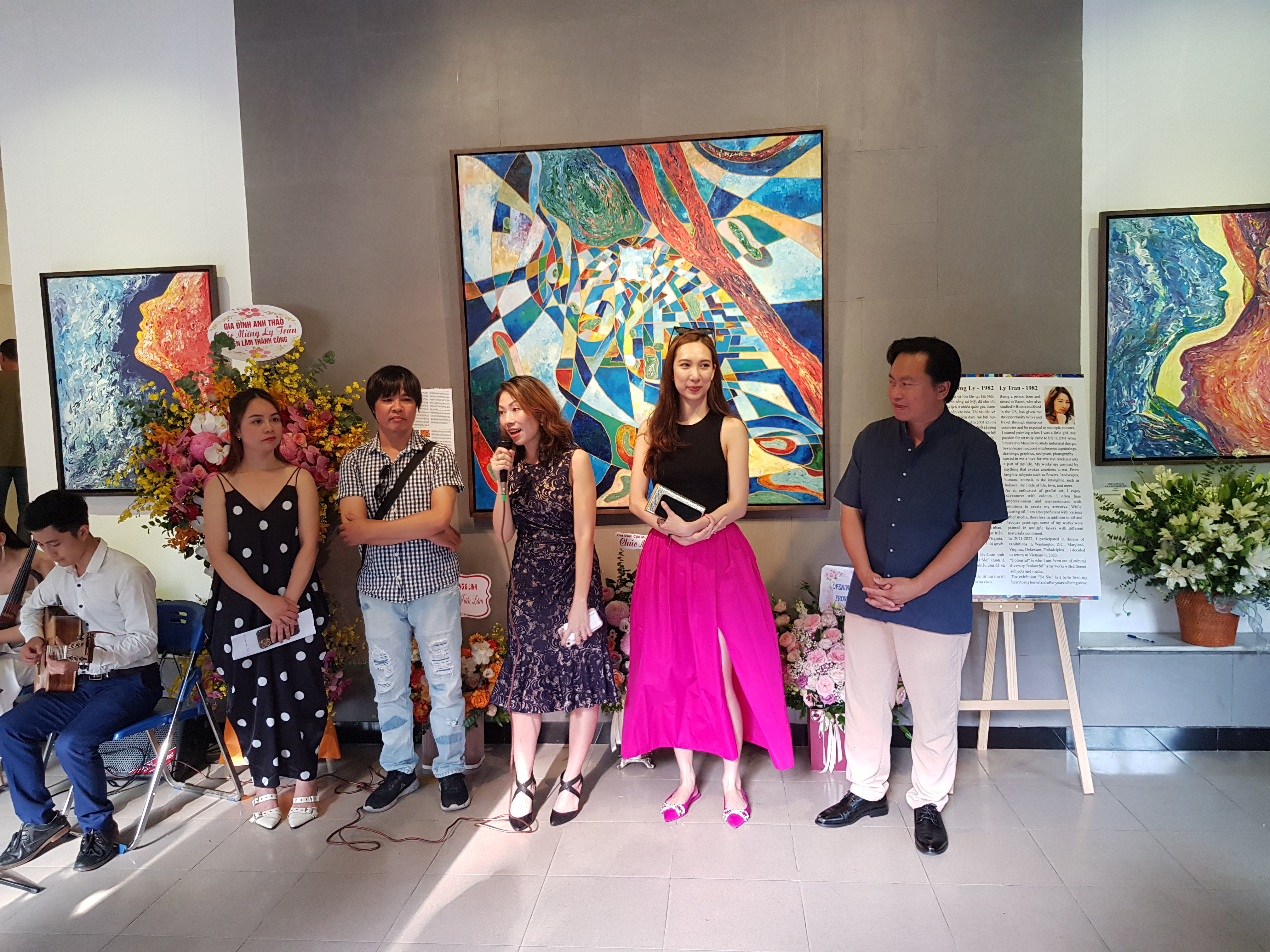 Họa sĩ Ly Trần ( giữa) phát biểu khai mạc triển lãm. Ảnh Ngọc Anh |