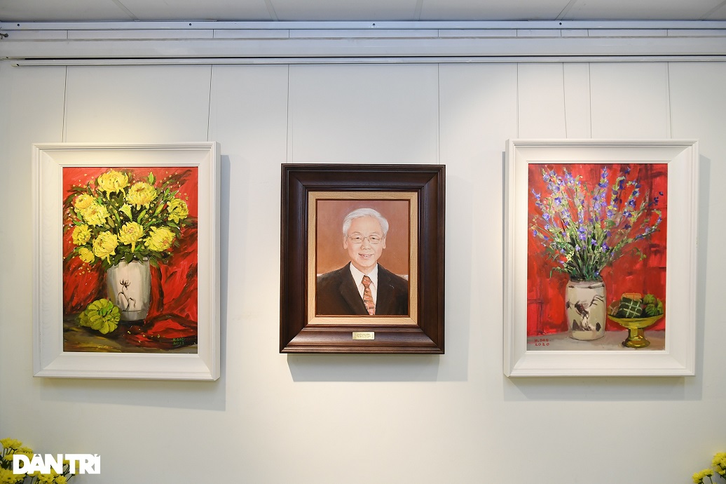 Một góc trang trọng của triển lãm trưng bày bức tranh chân dung ông Nguyễn Phú Trọng, Tổng Bí thư Ban Chấp hành Trung ương Đảng Cộng sản Việt Nam khóa XIII -Ảnh: dantri.com.vn |
