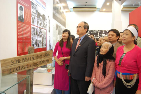 | Ông Nguyễn Thiện Nhân cùng các đại biểu tham quan triển lãm. Ảnh: qdnd.vn |