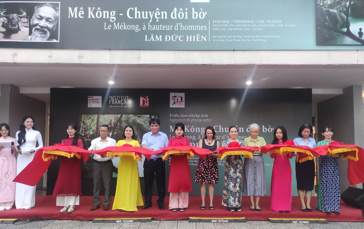 Các đại biểu cắt băng khai mạc triển lãm ảnh Nghệ thuật “Mekong - Chuyện đôi bờ”. Nguồn: Bảo tàng Mỹ thuật Đà Nẵng |