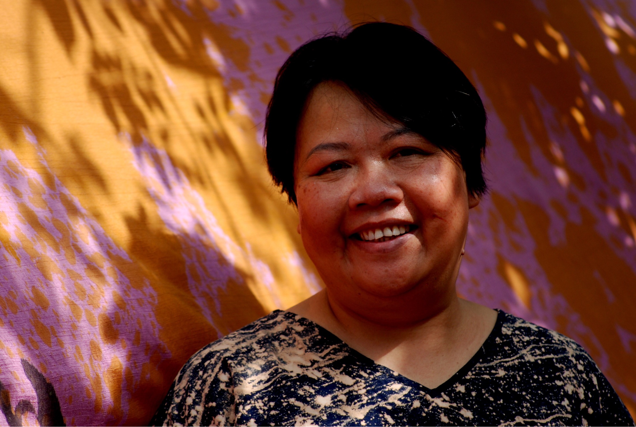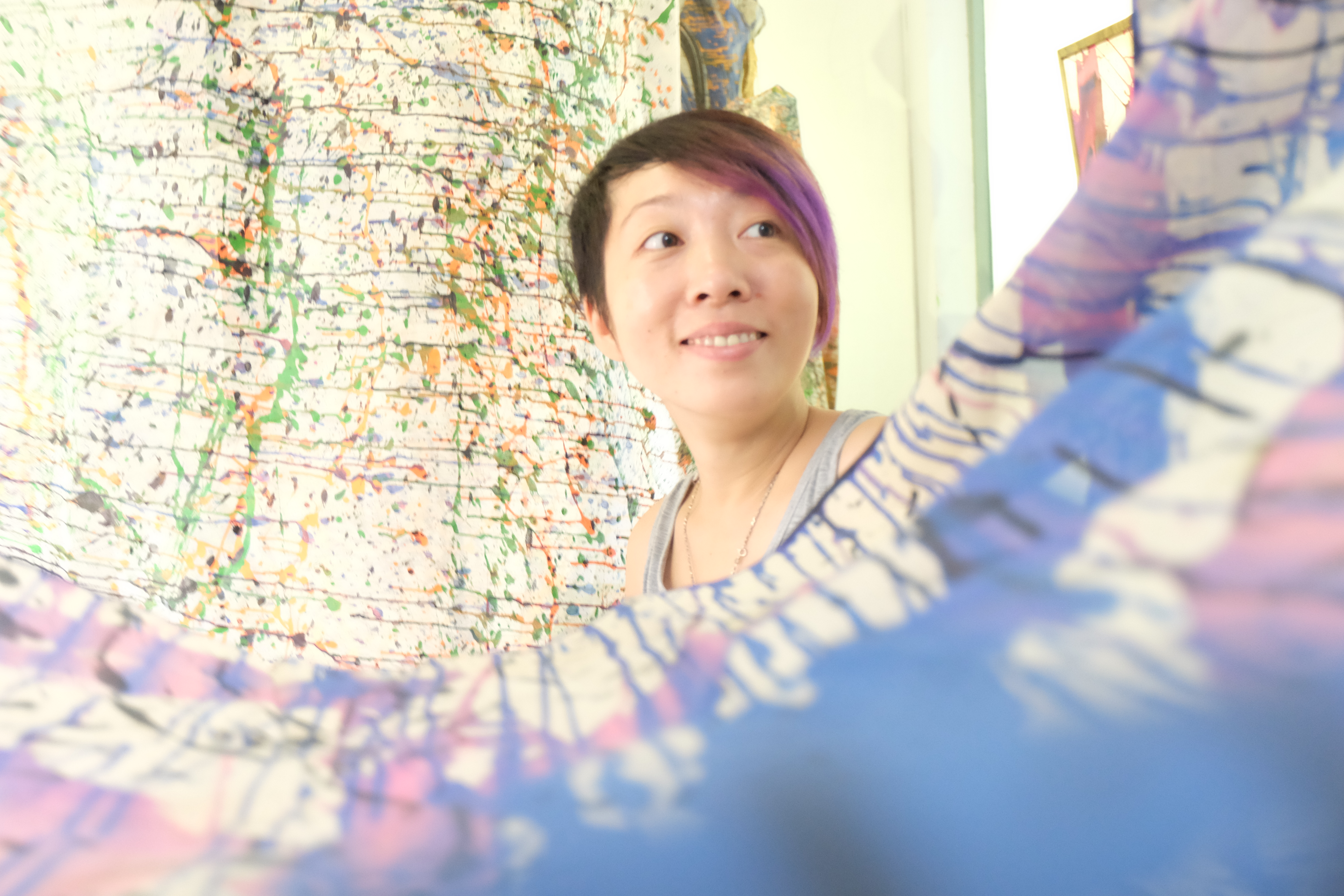 Trên nền chất liệu vải tự nhiên truyền thống như tơ tằm sống, đũi, lụa, hoạ sỹ sử dụng màu nước và Acrylic đi nhẹ nhàng và mạnh mẽ tạo cảm giác nhiều biến ảo về không gian, khi thật gần khi thật xa như những sự kết nối của tiếng tơ hay sợi tơ kết nối con người xích lại gần nhau.