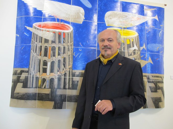 | Hoạ sĩ Peter Pollág bên tác phẩm "Tìm thấy nhau". Ảnh: Lê Quang Vinh/Báo Lao động |