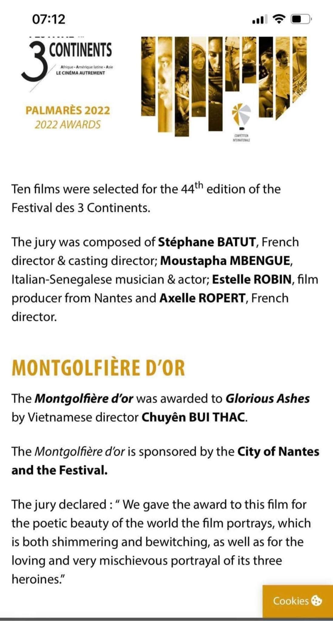 Tro tàn rực rỡ (tựa tiếng Anh: “Glorious Ashes”) đã thắng Giải Khinh khí cầu vàng - giải thưởng cao nhất tại LHP quốc tế 3 châu lục (Festival des Trois Continents) tại Nantes, Pháp. Ảnh: Ngô Quang Tuấn/ FBNV |