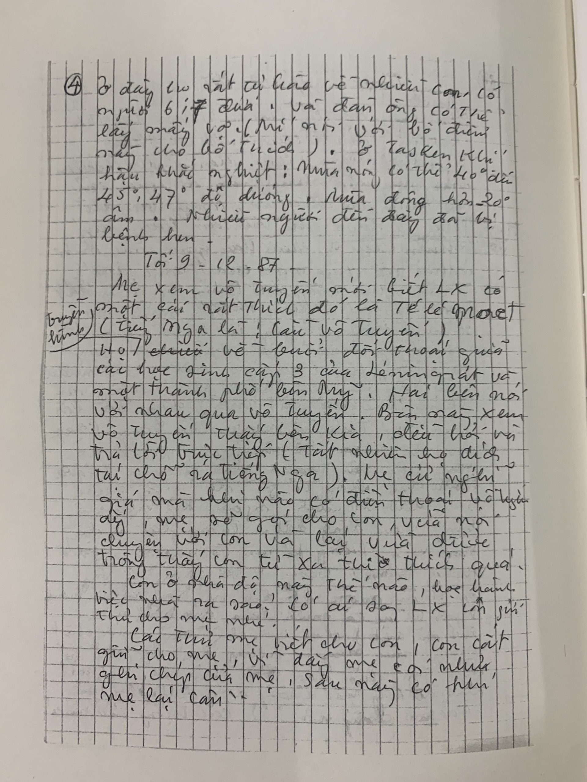“Mẹ đi trên con đường chiến tranh. Thức với trăng qua những bến phà, hố bom, vết đạn, pháo sáng dày đặc. Mẹ đi qua như qua những buồn vui của đời mẹ, những con đường chiến tranh này luôn luôn có cái chết rình bên cạnh, nhưng mẹ không sợ bằng lúc mẹ bắt đầu đi, vượt qua cái tình cảm gia đình (xa con).