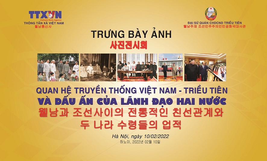 (VOV5) - Nhân kỷ niệm 72 năm thiết lập quan hệ ngoại giao giữa nước Cộng hòa Xã hội chủ nghĩa Việt Nam và nước Cộng hòa Dân chủ Nhân dân Triều Tiên, 65 năm cuộc gặp gỡ đầu tiên giữa Chủ tịch Hồ Chí Minh và Chủ tịch Kim Nhật Thành, ngày 10/02, Thông tấn xã Việt Nam (TTXVN) phối hợp với Đại sứ quán Cộng hòa Dân chủ Nhân dân Triều Tiên tại Việt Nam tổ chức triển lãm ảnh với chủ đề “Quan hệ truyền thống Việt Nam - Triều Tiên và dấu ấn của lãnh đạo hai nước”.