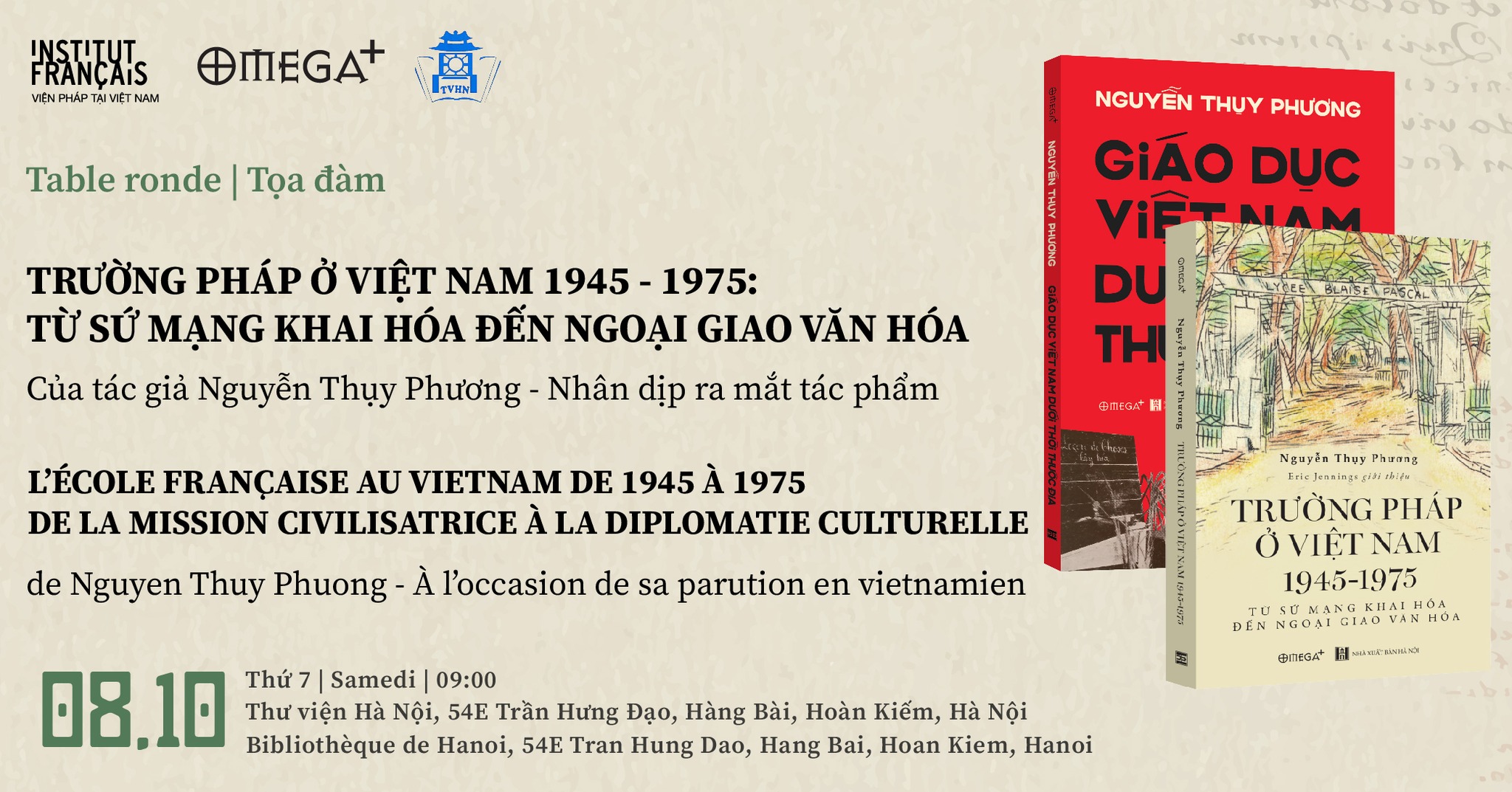 Nhân dịp ra mắt tác phẩm Trường Pháp ở Việt Nam 1945-1975, Viện Pháp tại Hà Nội và Công ty Cổ phần sách Omega Việt Nam (Omega Plus Books) tổ chức tọa đàm “Trường Pháp ở Việt Nam 1945-1975: Từ sứ mạng khai hóa đến ngoại giao văn hóa” vào sáng 8/10 tại Hà Nội. Sự kiện có sự tham gia của các diễn giả: tác giả Nguyễn Thụy Phương, ông Arnaud Pannier, tùy viên hợp tác giáo dục, Đại sứ quán Pháp tại Việt Nam, Tiến sĩ, nhà phê bình văn học Mai Anh Tuấn.