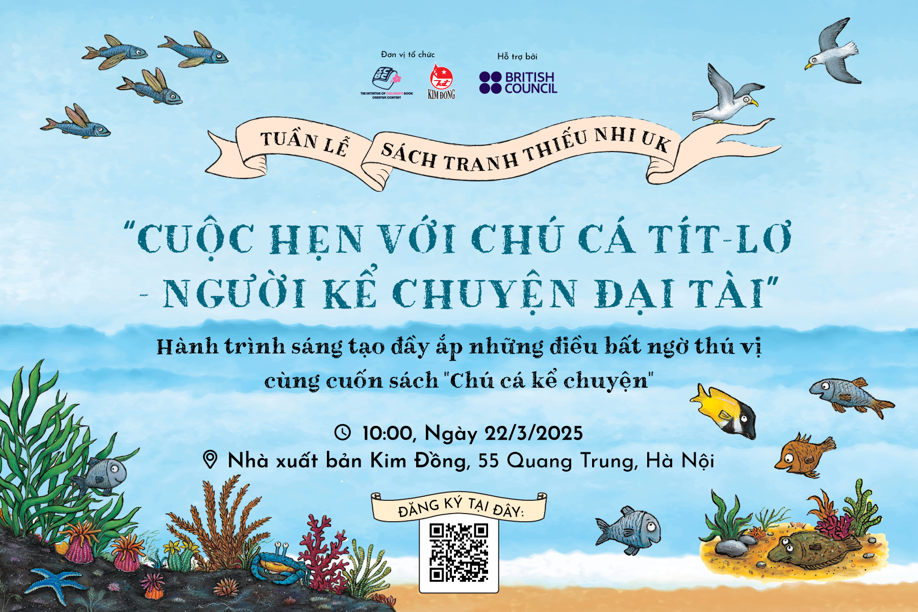 Sự kiện “Cuộc hẹn với chú cá Tít-lơ - người kể chuyện đại tài” diễn ra vào 10h ngày 22/3, cho các bạn nhỏ từ 5 tuổi trở lên cùng bước vào hành trình sáng tạo đầy ắp những điều bất ngờ thú vị của trí tưởng tượng phong phú và ngôn ngữ diệu kỳ trong cuốn sách “Chú cá kể chuyện” của bộ đôi tác giả - hoạ sĩ nổi tiếng với những tác phẩm được trẻ em trên khắp thế giới yêu thích Julia Donaldson và Axel Scheffler. Chú cá Tít-lơ - người kể chuyện siêu tài dẫn dắt bạn đọc bước vào những câu chuyện hồi hộp, gay cấn nhưng cũng không kém phần duyên dáng, hài hước để khơi dậy niềm vui đọc và trí tò mò của các bạn nhỏ về thế giới xung quanh mình.