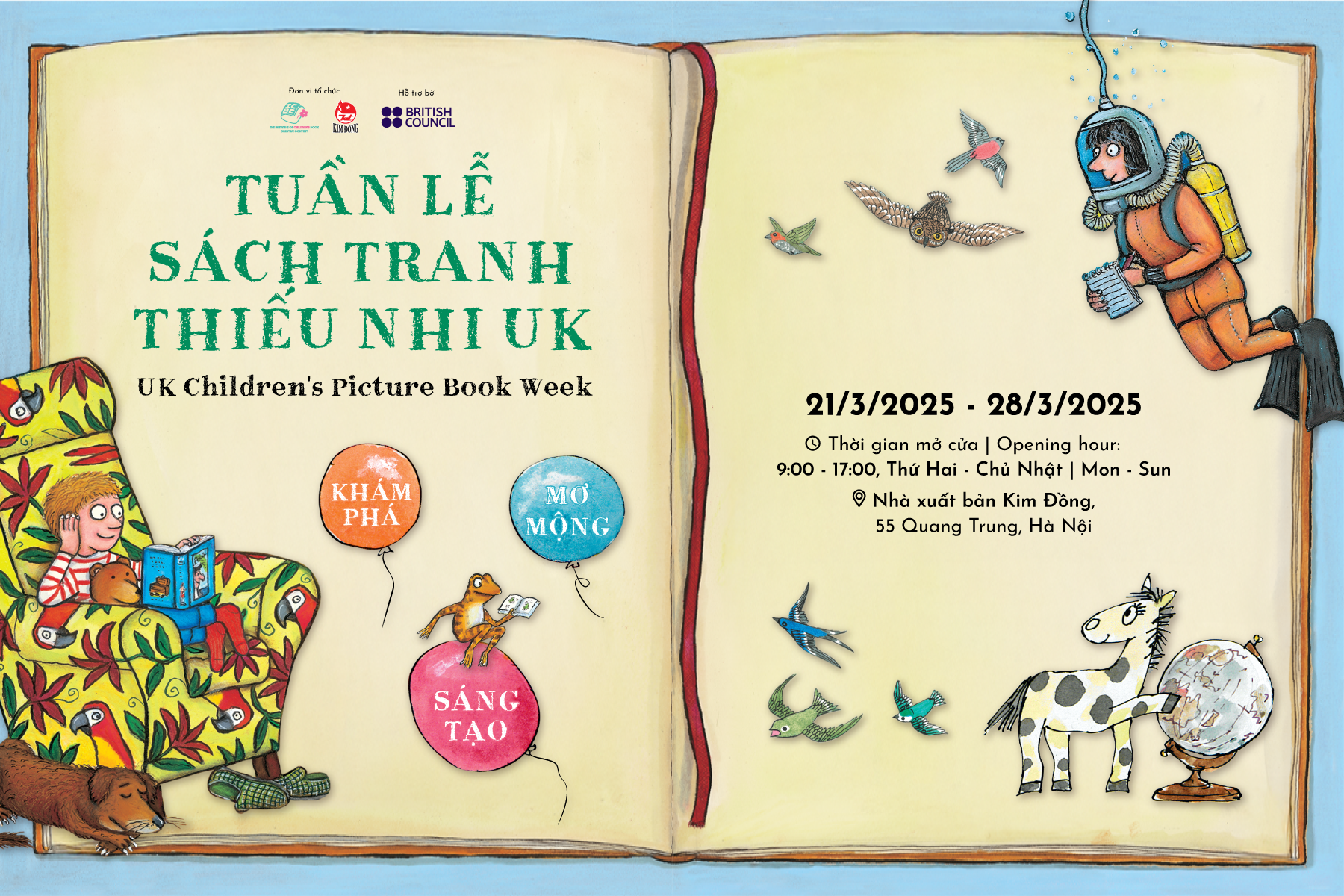 “Tuần lễ sách tranh thiếu nhi UK: Khám phá, Mơ mộng, Sáng tạo” là một sáng kiến của The Initiative of Children's Book Creative Content (ICBC), được tổ chức với sự đồng hành của Nhà xuất bản Kim Đồng và sự hỗ trợ của Hội đồng Anh tại Việt Nam. Chương trình mời gọi các độc giả nhỏ tuổi và các độc giả yêu thích văn học thiếu nhi, đặc biệt là văn học thiếu nhi Vương quốc Anh (UK) cùng bước vào hành trình sáng tạo đầy ắp những điều bất ngờ của trí tưởng tượng và ngôn ngữ diệu kỳ trong tác phẩm của các tác giả và hoạ sĩ nổi tiếng đến từ Anh quốc như Judith Kerr, John Yeoman và Quentin Blake, Julia Donaldson và Axel Scheffler.