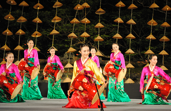 | Vũ điệu trống dân gian Jangguchum của những thiếu nữ xinh đẹp trong sắc phục truyền thống cùng chiếc trống đồng hồ cát gợi nên vẻ đẹp của sức sống thanh xuân - Ảnh: huefestival.com |