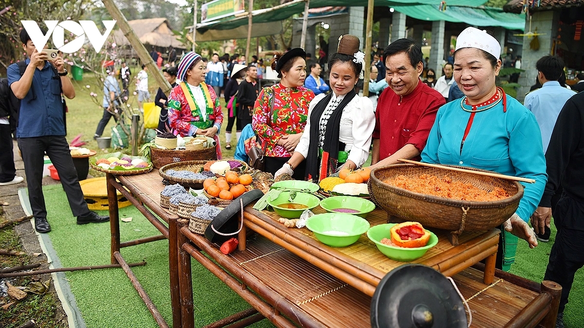 Tại không gian chợ phiên còn có chương trình trình diễn nghệ thuật làm xôi ngũ sắc của đồng bào các dân tộc vùng cao phía Bắc. Ảnh: Thư Vũ/VOV |