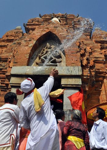 | Nghi thức té nước lên tháp để cầu mong mọi điều tốt lành, sau khi đã cúng thần xong.Ảnh: vanhien.vn |