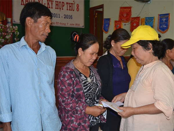 | Đại diện Chi hội Bảo trợ bệnh nhân nghèo quận Thủ Đức tặng quà cho gia đình các ngư dân Lý Sơn. Ảnh: bienphong.com.vn |