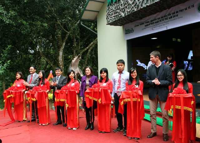 | Các đại biểu cắt băng khai trương Trung tâm Giáo dục và Bảo tồn Tê tê (Ảnh: dantri.com.vn) |