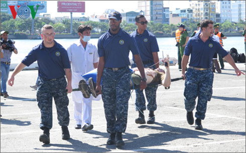 | Lực lượng cứu hộ của Chương trình Đối tác Thái Bình Dương đưa nạn nhân lên bờ cấp cứu |