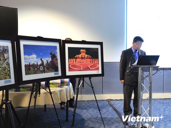 | Thứ trưởng Bộ Văn hóa-Thể thao và Du lịch Hồ Anh Tuấn giới thiệu sản phẩm du lịch Việt Nam trong khuôn khổ Hội chợ Du lịch thế giới 2014 ở London, Anh. (Ảnh: Đỗ Sinh/Vietnam+) |