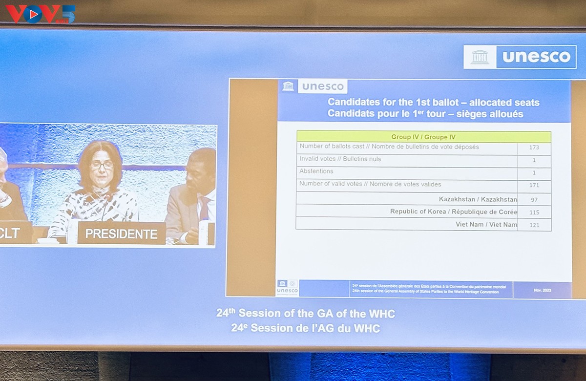 Với 121 phiếu thuận, trên tổng số 171 phiếu hợp lệ, đây là lần thứ 2 Việt Nam tiếp tục trúng cử vị trí thành viên của Ủy ban Di sản Thế giới. Ảnh: Anh Tuấn/VOV |