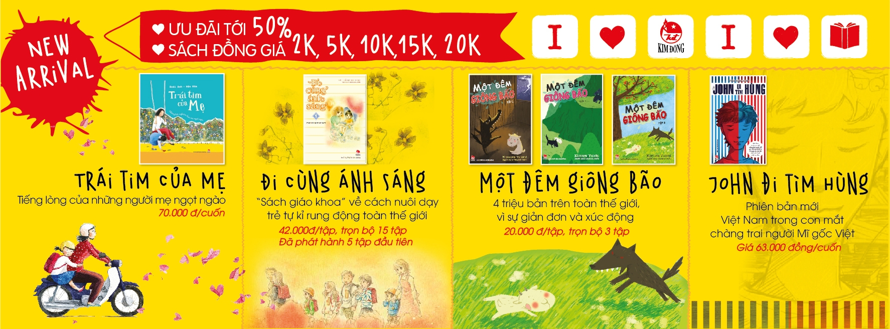 Nhà xuất bản Kim Đồng áp dụng chính sách ưu đãi lớn nhất dành cho độc giả lên đến 50%, các gian sách đồng giá 2.000đ, 5.000đ, 10.000đ, 15.000đ... sẽ mang đến những lựa chọn thú vị, bất ngờ. Các combo sách hấp dẫn với chiết khấu và quà tặng đính kèm. Mọi đơn hàng đều nhận được quà, độc giả càng mua nhiều càng có lợi.