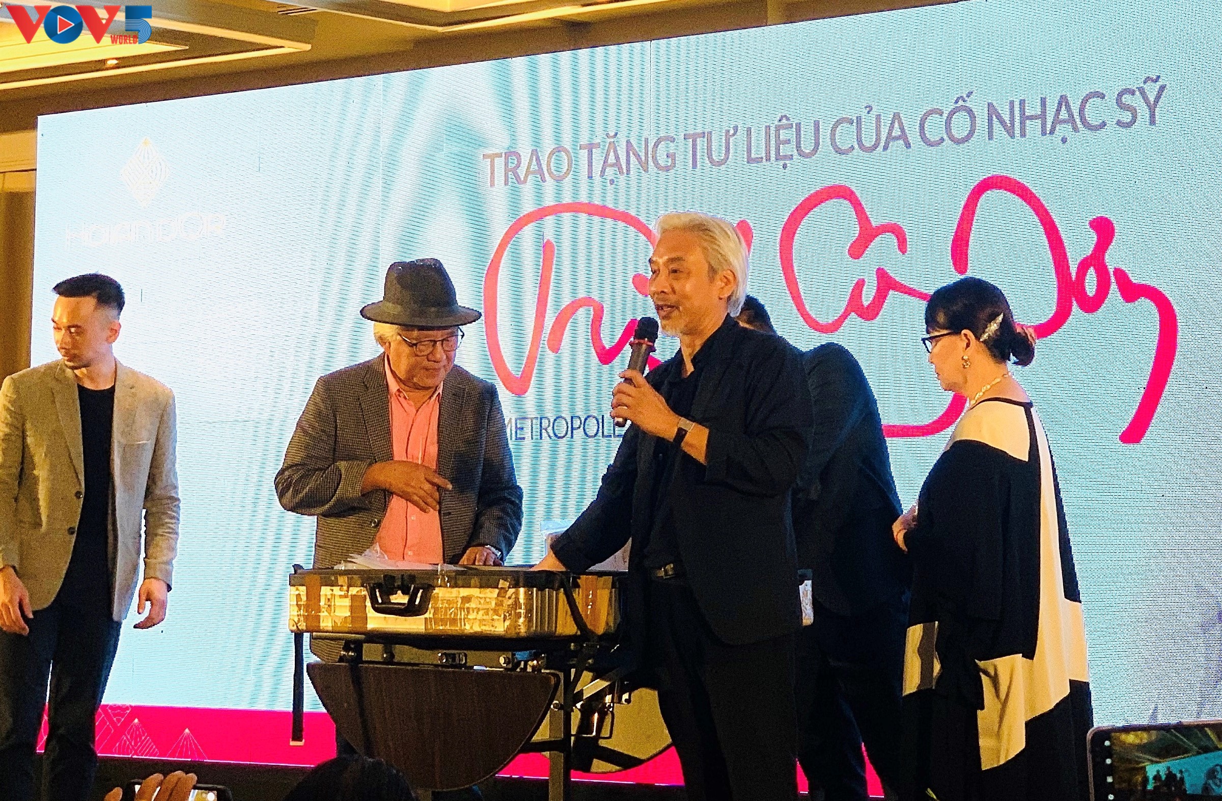 Nhiếp ảnh gia Dương Minh Long trao lại tư liệu gốc về Trịnh Công Sơn cho gia đình. - Ảnh: Phạm Hằng, Kim Huệ |
