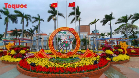 (VOV5) - Tại đường hoa xuân trên đường Bạch Đằng, linh vật con Trâu - con giáp năm Tân Sửu, được tạo hình trâu vàng, trâu kéo cày trên đồng, trâu trong tranh dân gian...
