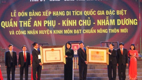 (VOV5) - Tối 10/12, tại huyện Kinh Môn, tỉnh Hải Dương tổ chức lễ đón bằng xếp hạng di tích quốc gia đặc biệt quần thể An Phụ - Kính Chủ - Nhẫm Dương và công nhận huyện Kinh Môn đạt chuẩn nông thôn mới. Đây là di tích quốc gia đặc biệt thứ hai của Hải Dương, sau khu di tích Côn Sơn - Kiếp Bạc ở thị xã Chí Linh.
