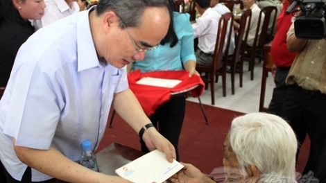 (VOV5) - Ngày 29/4, ông Nguyễn Thiện Nhân, Chủ tịch Ủy ban Trung ương Mặt trận Tổ quốc Việt Nam đến thăm và tặng 127 phần quà cho các gia đình chính sách tại tỉnh Trà Vinh (mỗi phần trị giá 3 triệu đồng).