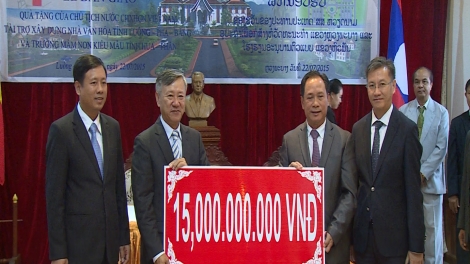 (VOV5)- Thừa ủy quyền của Chủ tịch nước Trương Tấn Sang, Đại sứ Việt Nam tại CHDCND Lào Nguyễn Mạnh Hùng đã bàn giao số tiền 55 tỷ đồng là quà tặng của Chủ tịch nước Trương Tấn Sang cho hai tỉnh