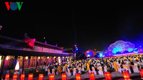 (VOV5) - Đêm khai mạc Festival Huế 2014 trong không gian màu sắc rực rỡ, sân khấu khán đài được thiết kế độc đáo, mới lạ đã thu hút hơn 2 vạn du khách đến tham dự.