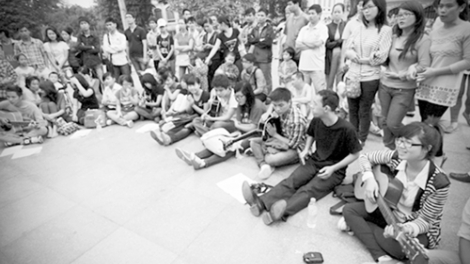 (VOV5) - Không sân khấu, không có những giàn đèn màu, hay hệ thống loa đài, âm thanh, cũng chẳng có những hàng ghế cho khán giả... Thế nhưng phần trình diễn của nhóm "Du ca đường phố" vẫn luôn thu hút sự chú ý của khách bộ hành đi ngang qua tượng đài Lý Thái Tổ trên con phố Đinh Tiên Hoàng, Hà Nội.