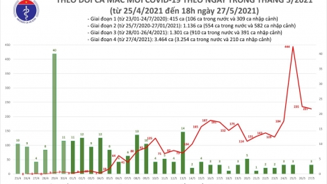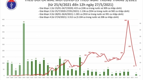 (VOV5) - Tính đến 12h ngày 27/5, Việt Nam có tổng cộng 4.674 ca ghi nhận trong nước và 1.490 ca nhập cảnh. Số lượng ca mắc mới tính từ ngày 27/4 đến nay: 3.104 ca.