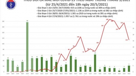 (VOV5) - Tính từ 12h đến 18h ngày 20/5, Việt Nam có 45 ca mắc mới COVID-19 (BN4765-4809), gồm 5 ca nhập cảnh và 40 ca trong nước.
