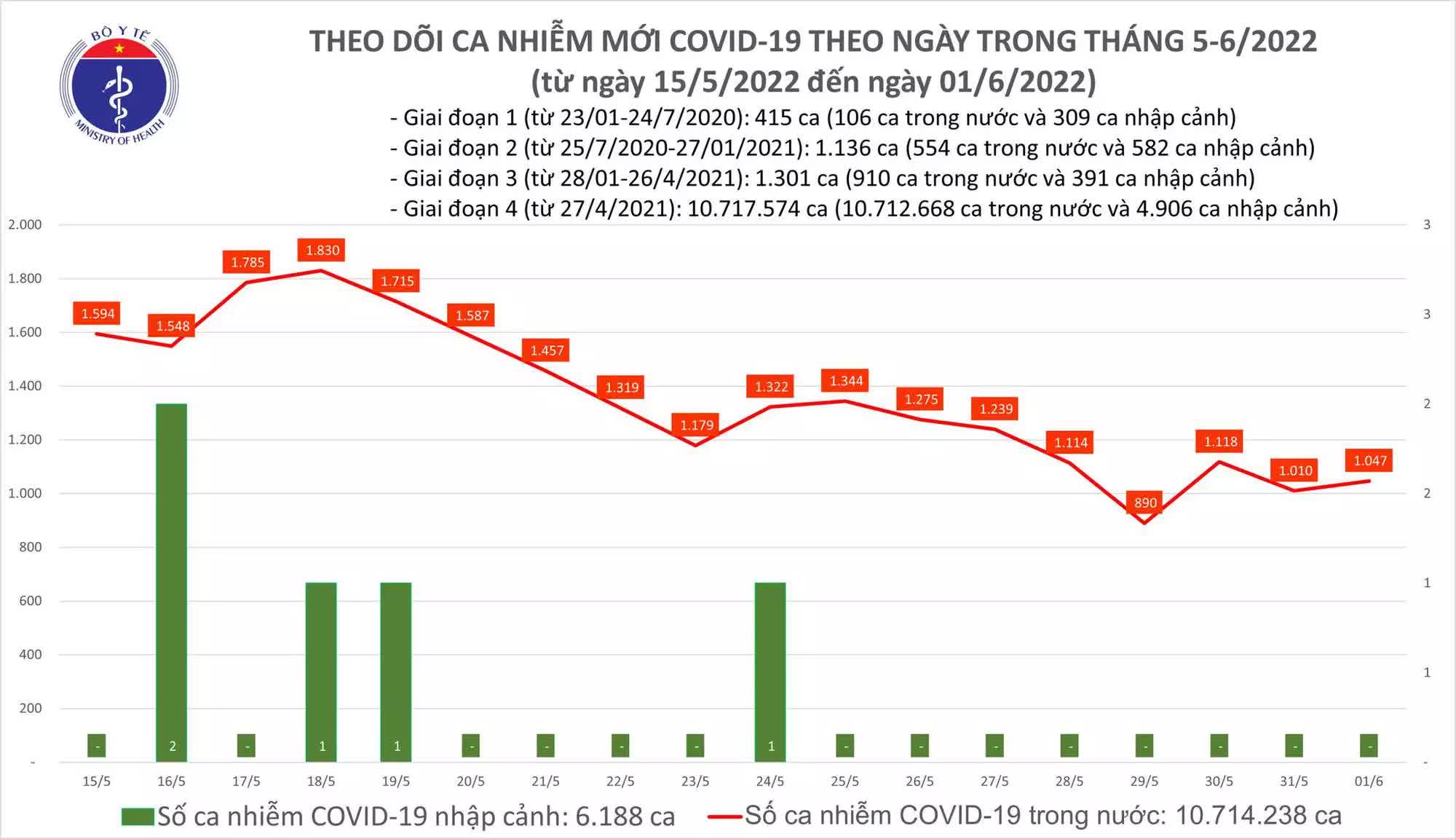 Tính từ 16h ngày 31/05 đến 16h ngày 01/06, Việt Nam ghi nhận 1.047 ca mắc mới COVID-19 đều ở trong nước, tại 40/63 tỉnh, thành phố. Tính đến thời điểm hiện tại, Việt Nam có 10.720.426 ca mắc COVID-19.