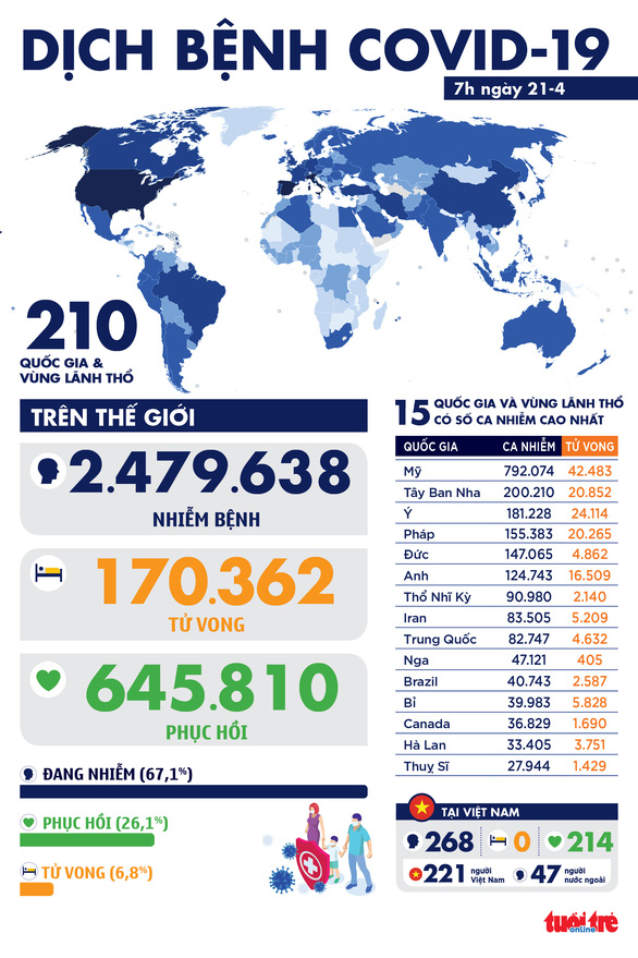Tổng số ca mắc trên cả nước vẫn là 268 người. Hiện Việt Nam chỉ còn 53 bệnh nhân đang được cách ly, điều trị tại 09 cơ sở y tế, trong đó có 14 ca có kết quả xét nghiệm 1 lần âm tính và 7 ca có kết quả xét nghiệm 2 lần âm tính với SARS-CoV-2.