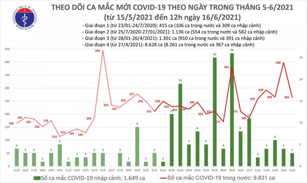 Tính từ 6h - 12h ngày 16/6, cả nước có 176 ca mắc COVID-19 mới, gồm 2 ca cách ly ngay sau khi nhập cảnh tại Tây Ninh và 174 ca ghi nhận trong nước tại Bắc Giang (128), TP.HCM (35), Bắc Ninh (8), Hà Tĩnh (2) và Nghệ An (1).