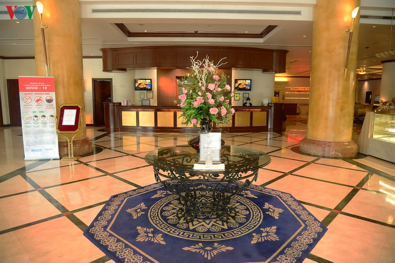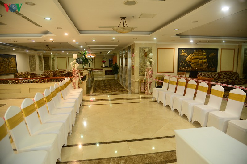 Sau khi đăng ký nhận phòng, nhân viên khách sạn sẽ sang khu vực lễ tân riêng để làm các thủ tục sau đó. Khu vực ngồi chờ cách ly tạm thời đã được thiết lập.