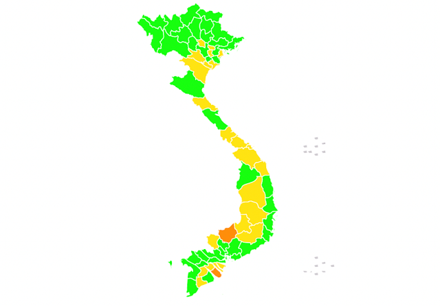 Màu xanh: Cấp 1; Màu vàng: Cấp 2; Màu cam: Cấp 3; Màu đỏ: Cấp 4. Nguồn: VNExpress |