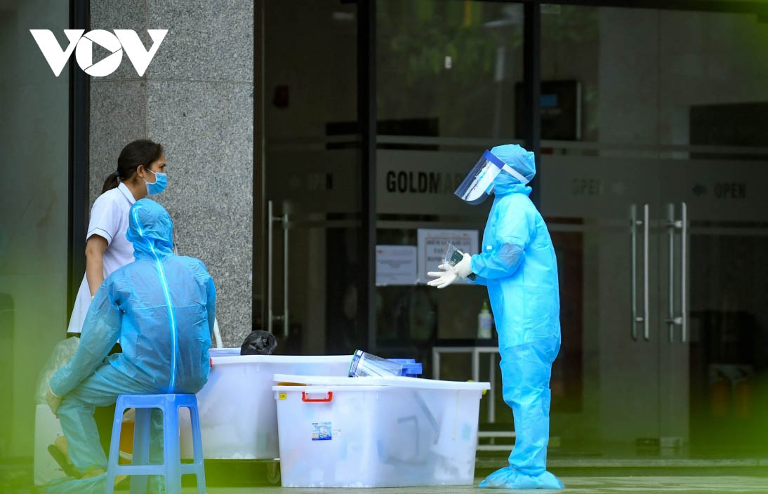 Lực lượng y tế lấy mẫu tại khu chung cư Goldmark City sau khi phát hiện ca mắc COVID-19 sinh sống tại đây. Ảnh: VOV |