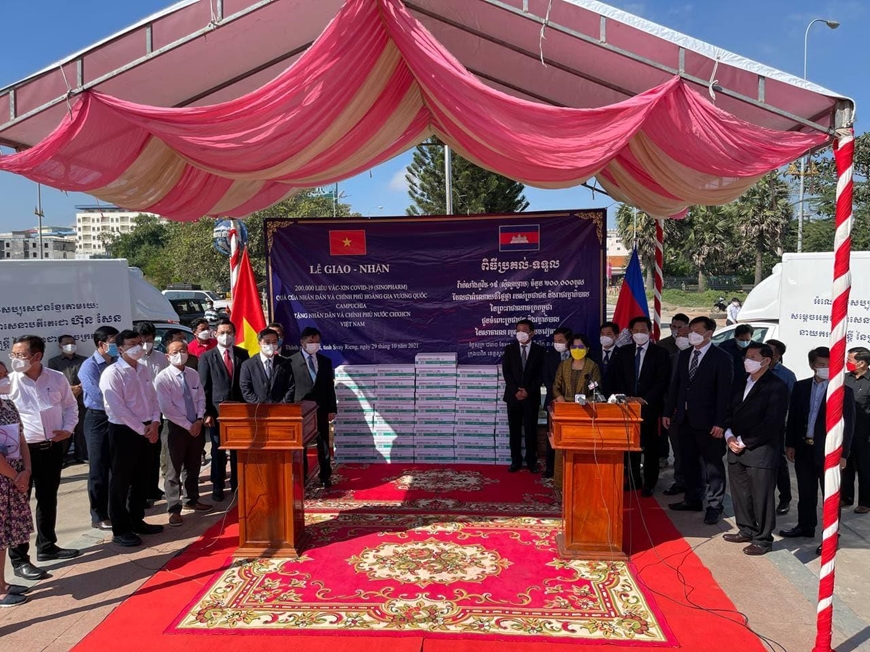 Phát biểu tại buổi lễ, bà Or Vandine, Quốc vụ khanh Bộ Y tế kiêm Chủ tịch Ủy ban Quốc gia tiêm chủng vaccine COVID-19, Chủ tịch Ủy ban Quốc gia tiêm chủng vaccine COVID-19, đại diện cho Thủ tướng Hun Sen nhấn mạnh, món quà này thể hiện tấm lòng chia sẻ giữa hai nước láng giềng cũng như sự quan tâm của cá nhân Thủ tướng Hun Sen đối với sức khỏe và hạnh phúc của người dân, đặc biệt cư dân sống dọc biên giới hai nước. Thứ trưởng Bộ Y tế Trần Văn Thuấn đánh giá cao sự hỗ trợ của Chính phủ Hoàng gia và nhân dân Campuchia. Bộ Y tế Việt Nam cam kết sẽ phân bổ số vắc xin này tới 2 tỉnh biên giới Tây Ninh và An Giang theo đề nghị của Thủ tướng Hun Sen để phòng, chống dịch COVID-19, đảm bảo sử dụng phù hợp, hiệu quả.