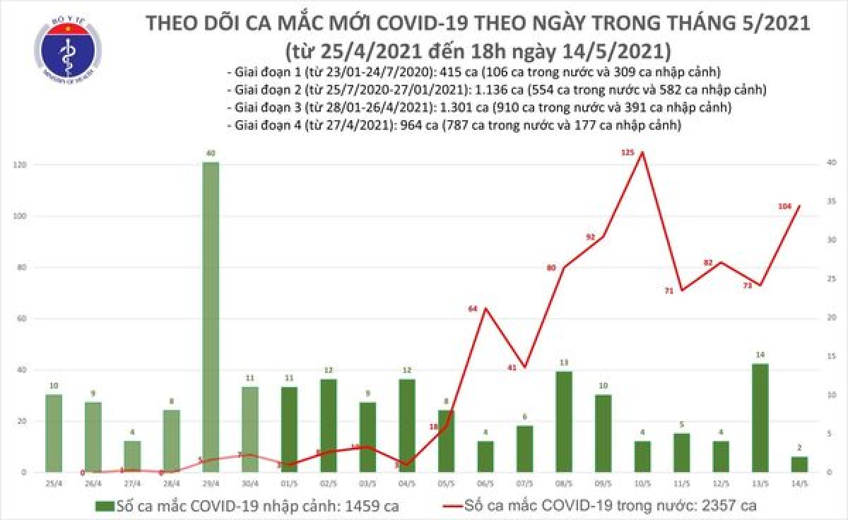 Cả nước không phát hiện các ổ dịch mới. Tính đến 18h ngày 14/5, Việt Nam có tổng cộng 2.357 ca ghi nhận trong nước và 1.459 ca nhập cảnh. Số lượng ca mắc mới tính từ ngày 27/4 đến nay là 787 người.