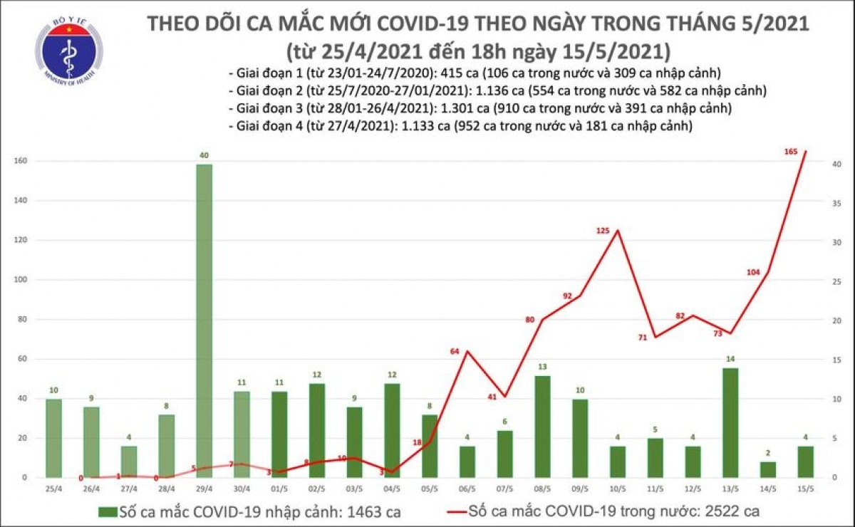Tính đến 18h ngày 15/5, Việt Nam có tổng cộng 2.522 ca ghi nhận trong nước và 1.463 ca nhập cảnh. Số ca mắc mới tính từ ngày 27/4 đến nay là 952 người. Từ 29/4 đến nay, cả nước thực hiện xét nghiệm 482.900 mẫu.