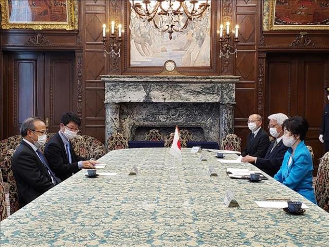Chủ tịch Thượng viện Nhật Bản Santo Akiko tiếp Đại sứ Việt Nam tại Nhật Bản Vũ Hồng Nam. Ảnh: Thanh Tùng/TTXVN |