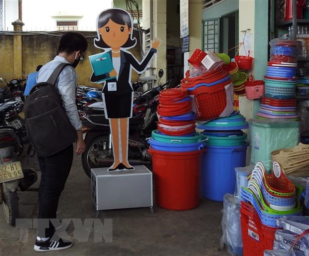 Máy tự động nhắc phòng dịch COVID-19 - mô hình tuyên truyền sáng tạo ở một huyện Đăk Hà (Kon Tum) - Ảnh: Cao Nguyên/TTXVN |