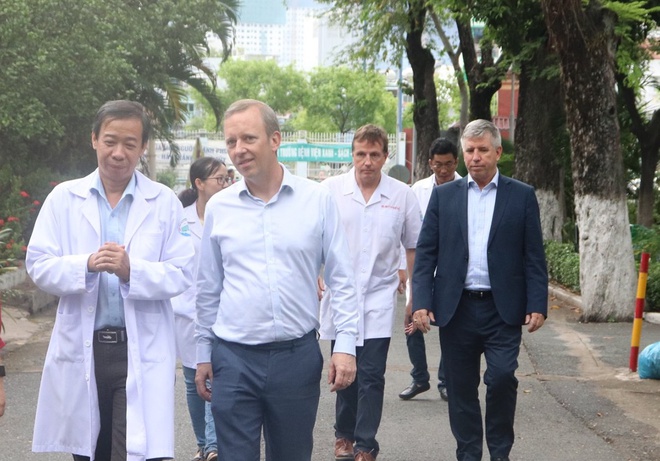 TS.BS Nguyễn Văn Vĩnh Châu, Giám đốc Bệnh viện Bệnh Nhiệt đới thành phố Hồ Chí Minh (trái) cùng Đại sứ Anh tại Việt Nam (giữa) trong chuyến thăm bệnh viện. Ảnh: Bệnh viện Nhiệt đới thành phố Hồ Chí Minh. |