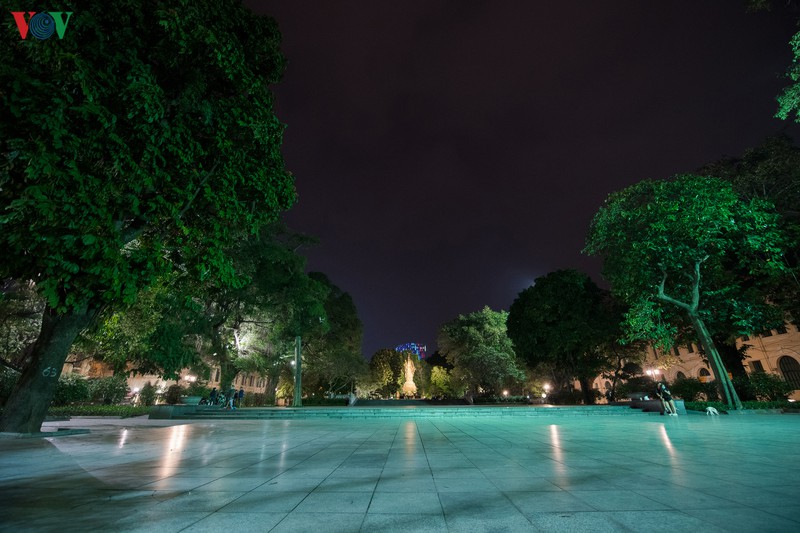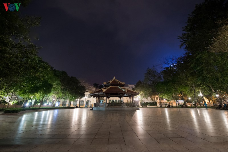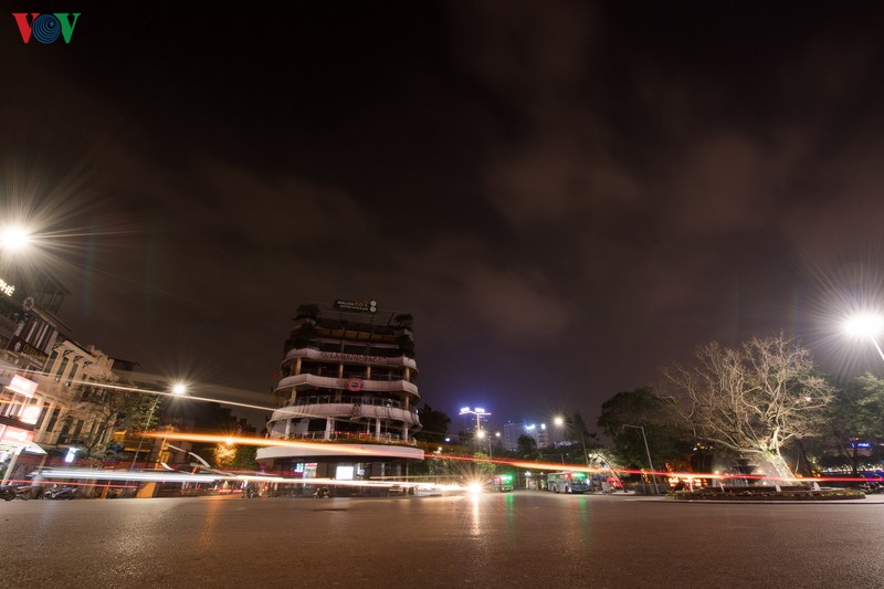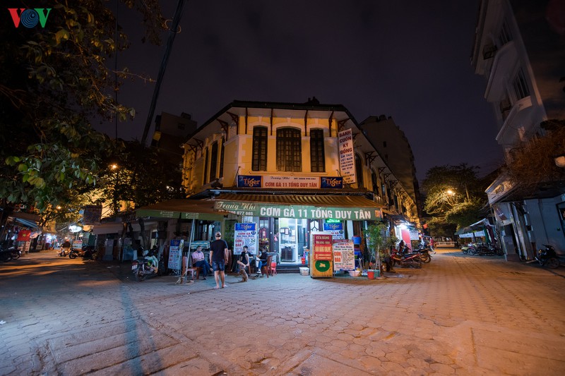 Quảng trường Đông Kinh Nghĩa Thục vắng bóng xe cộ đi lại. Tòa nhà "Hàm cá mập" nơi tập trung những quán ăn uống nổi tiếng nay cũng đã đóng cửa.